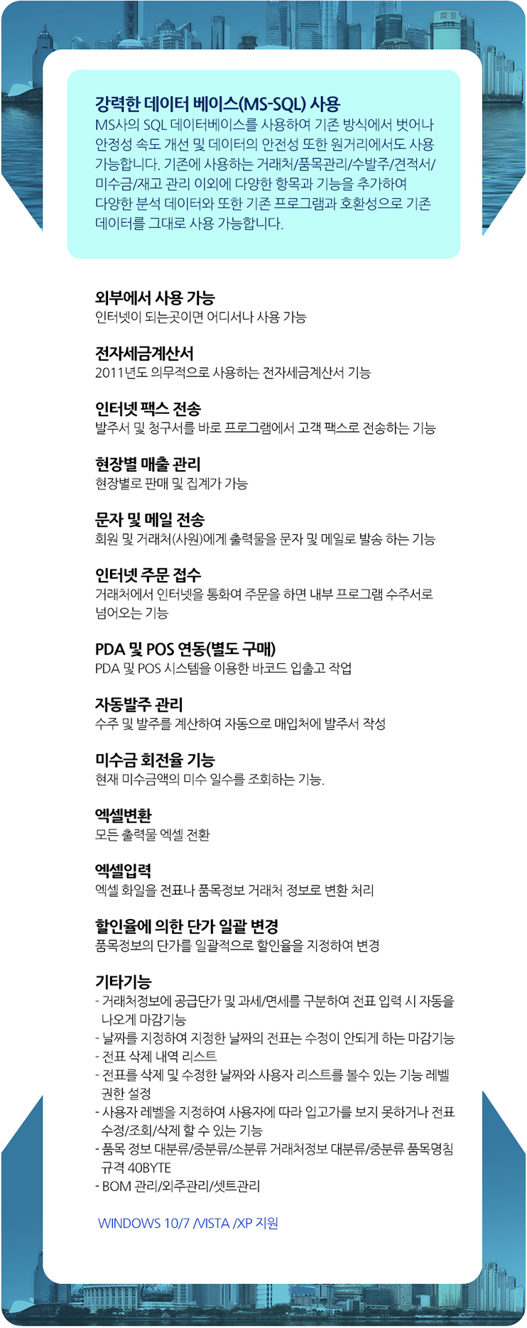기존에 사용하는 거래처/품목관리/수발주/견적서/미수금/재고 관리 이외에 다양한 항목과 기능을 추가하여 다양한 분석 데이터와 또한 기존 프로그램과 호환성으로 기존 데이터를 그대로 사용 가능합니다.