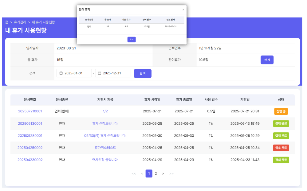 휴가관리 : 휴가정보 등록 및 연차, 반차 신청 프로세스 자동화